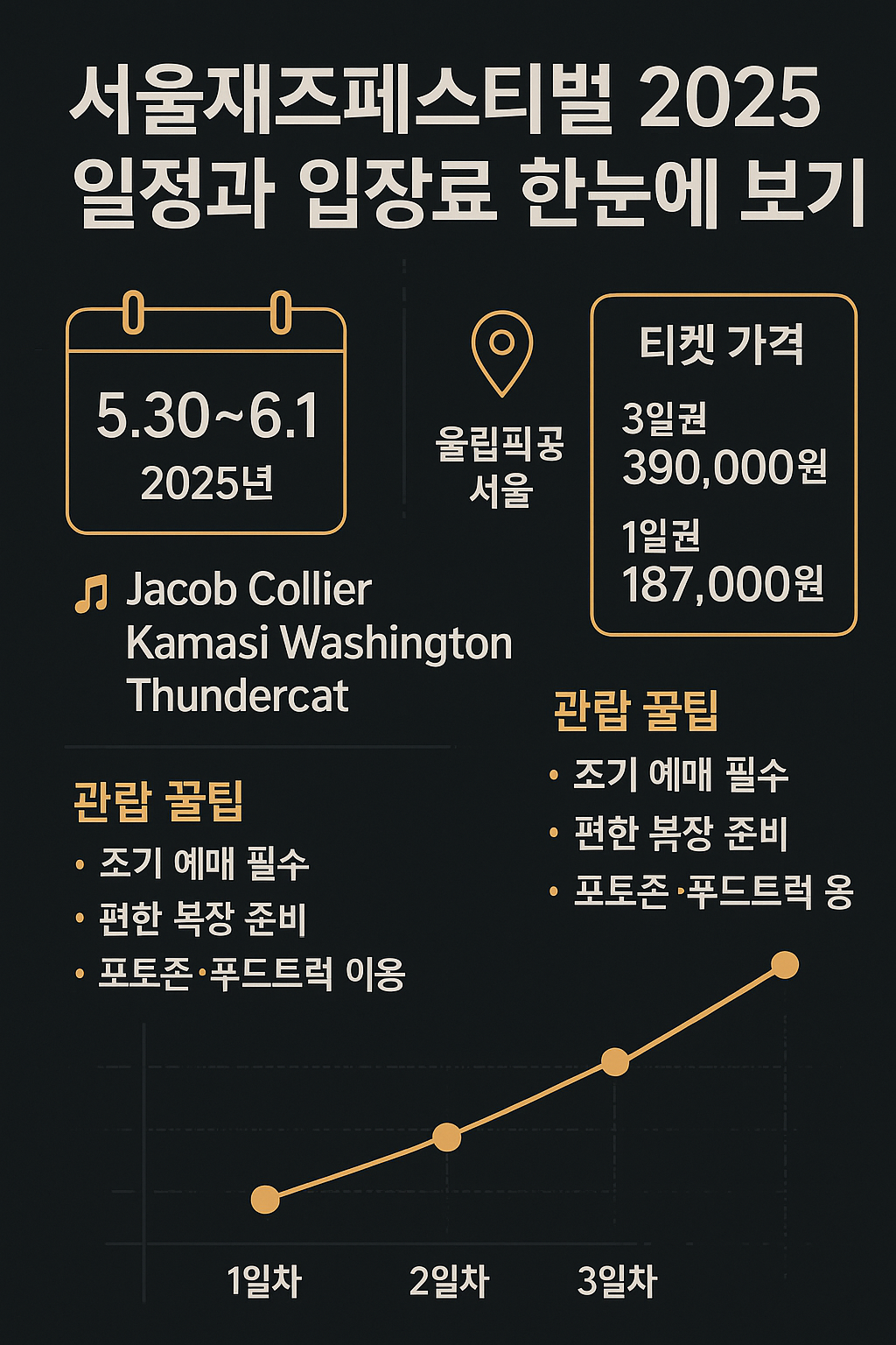 처음 페스티벌에 가신다면 '페스티벌룩'과 필수 준비물이 고민되실 텐데요. 서울재즈페스티벌 2025를 100% 즐기기 위한 관람 꿀팁을 알려드립니다!