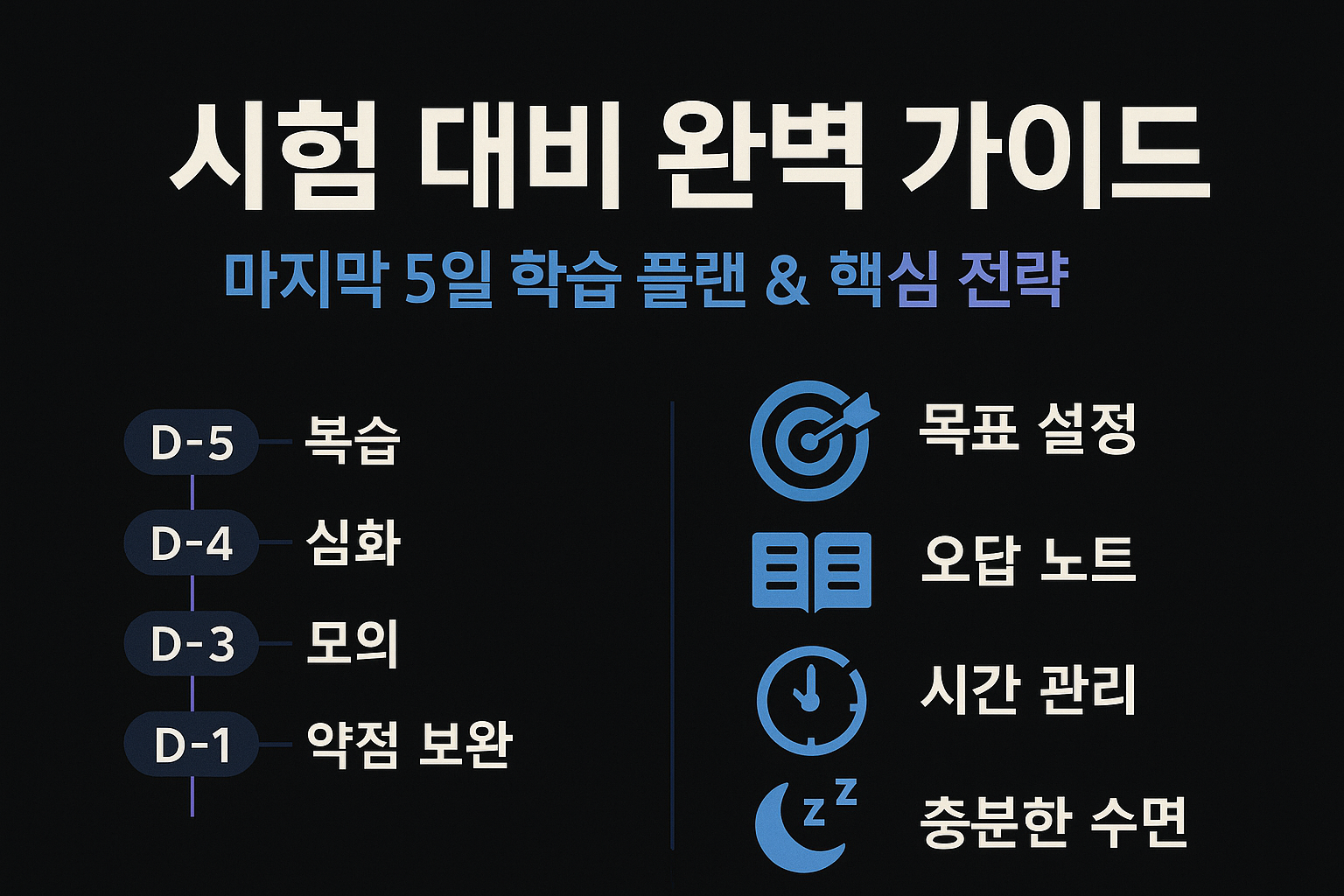 시험 전 마지막 5일은 효율적인 학습이 무엇보다 중요합니다. 아래는 예시 플랜이지만, 여러분에게 맞게 조정하세요: