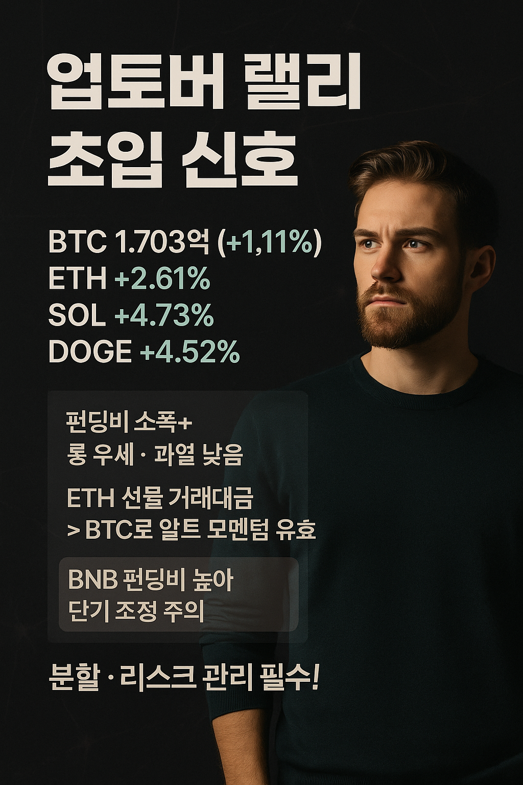 → 해석: 전반적 강세 베팅이 우세하나, 평균치가 과열 구간은 아니어서 추세는 우상향·과열은 제한적. 단, BNB는 펀딩비 과도 상승에 따른 단기 조정 리스크 유의.