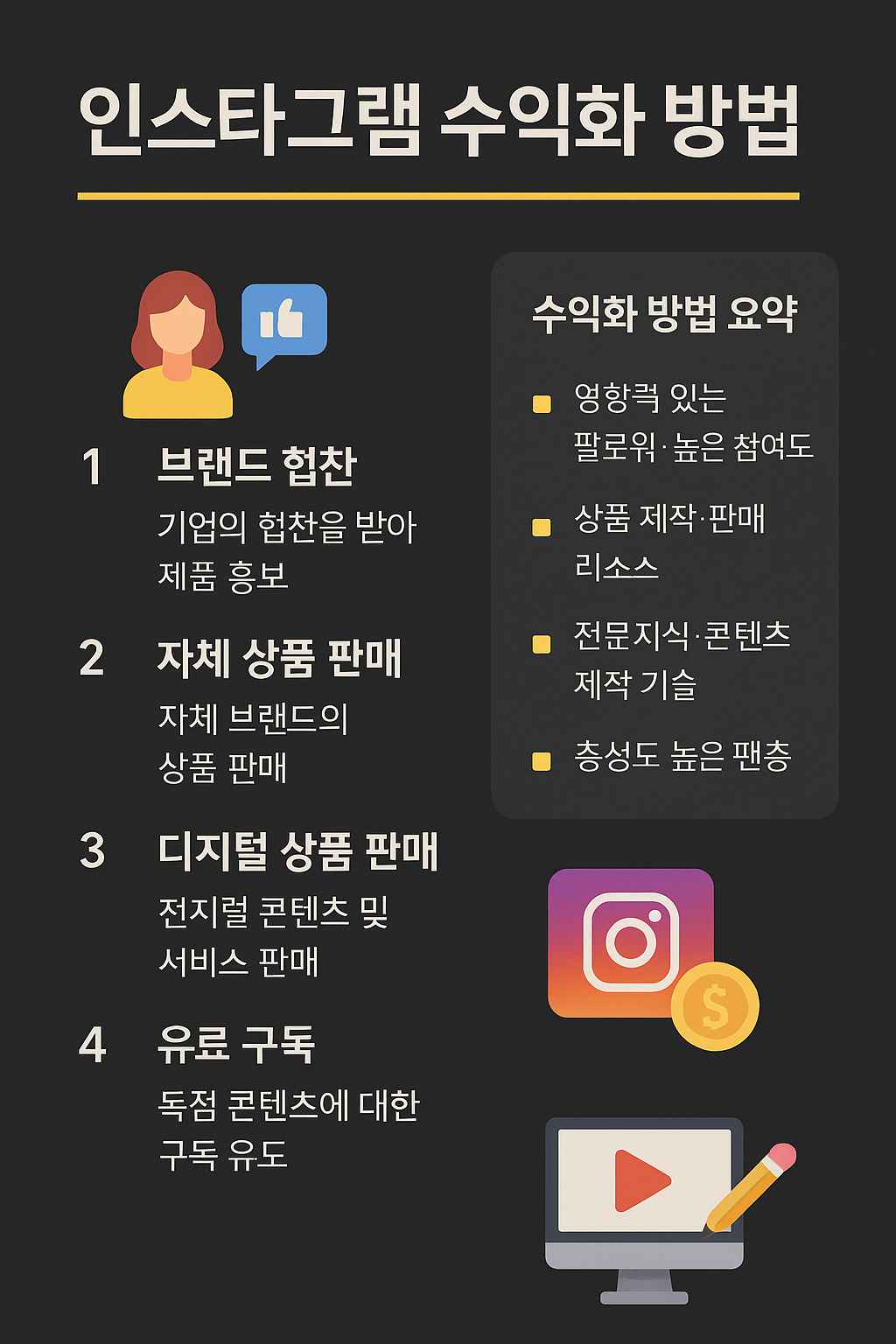 제휴 마케팅 | 제휴 링크/코드로 타사 제품 홍보 후 판매마다 커미션 획득 | 초기비용 거의 없음, 운영 부담 적음 | 낮은 수익률, 신뢰도 저하 위험, 콘텐츠 홍보 과도 주의 | 강력한 팔로워 네트워크, 높은 참여율 (추천) |