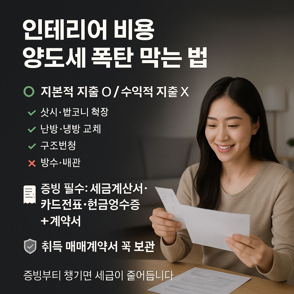 오늘 이 글에서는 어떤 인테리어 비용이 양도소득세 절세로 이어지는지, 그리고 그 혜택을 100% 누리기 위해 지금 당장 무엇을 해야 하는지 A to Z까지 모두 알려드리겠습니다.