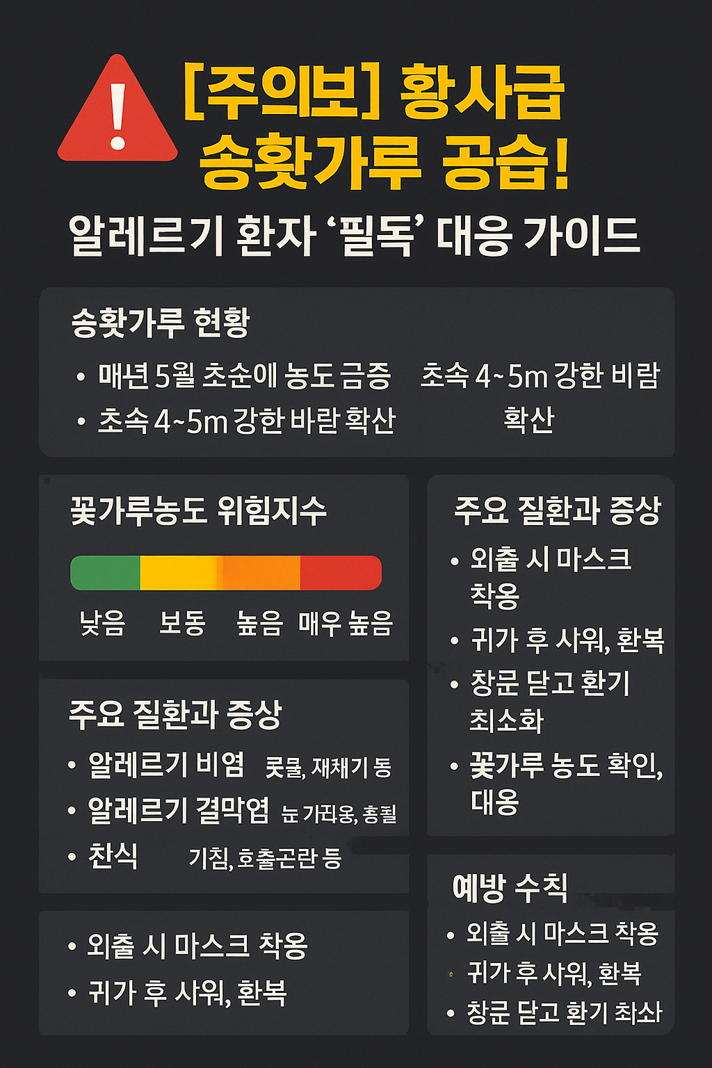 송홧가루,황사,꽃가루지수,알레르기,천식,미세먼지,예방수칙,건강관리,eSIM? (not relevant). Actually tags: 송홧가루,황사수준,꽃가루농도,알레르기비염,천식악화,꽃가루예방,건강위협,꽃가루지수,삼중고
