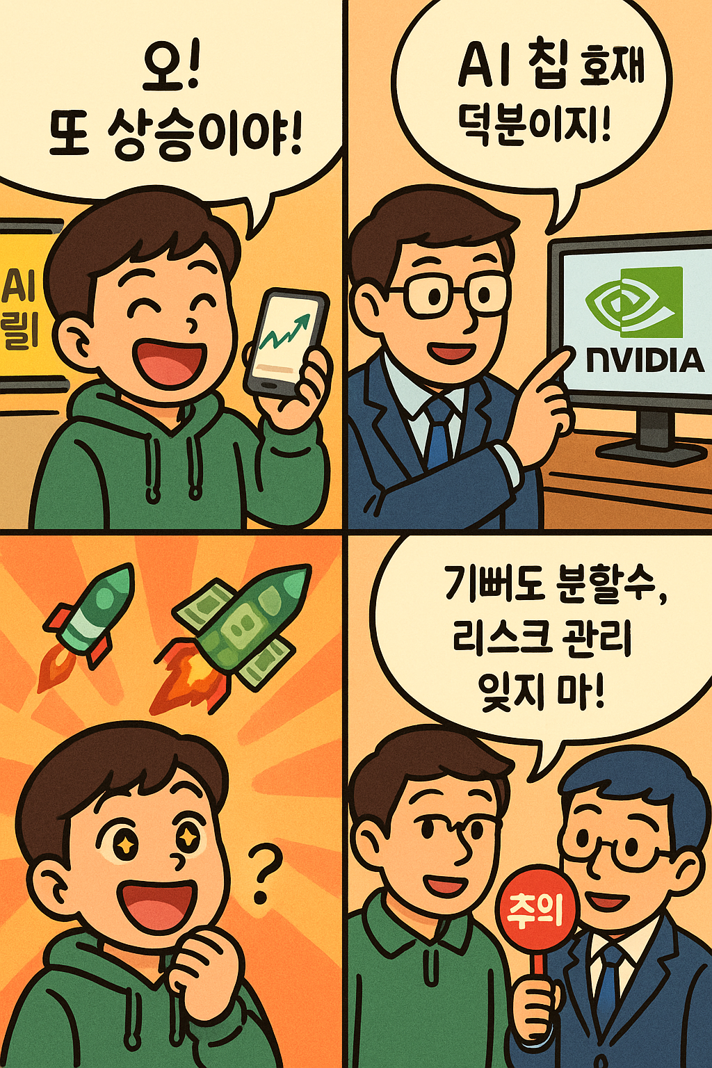 2컷 | “AI 칩 호재 덕분이지!” | 테마 급등에 과몰입 주의 |