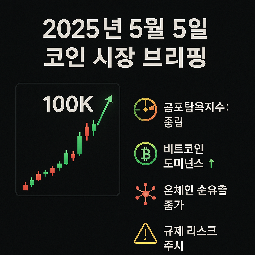 아래에서는 국내외 주요 이슈 및 경제 지표 분석, 온체인 데이터, 보조지표(거래량, 도미넌스, 펀딩비, 옵션 데이터 등)를 종합적으로 살펴보고, 이를 바탕으로 2025년 5월 5일 코인 시장의 방향성과 전망을 제시하겠습니다.