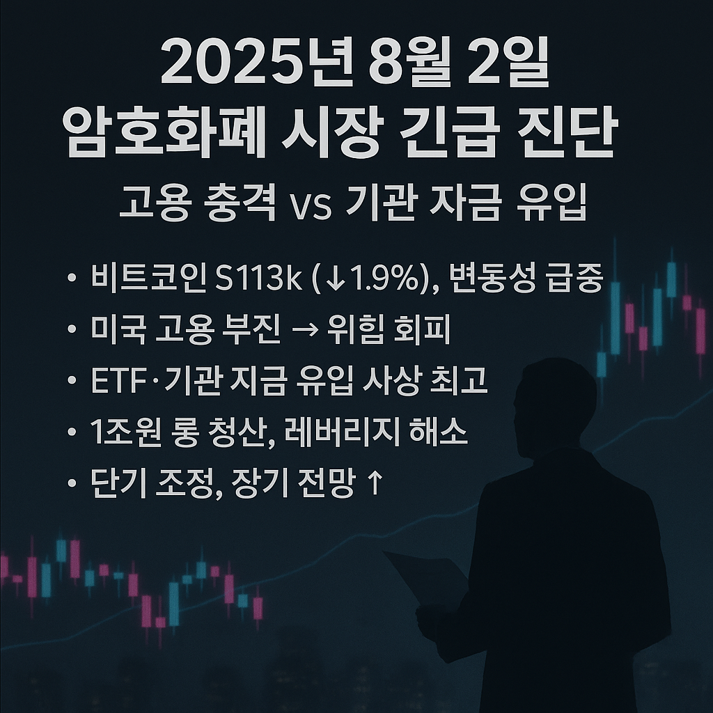2025년 8월 2일, 암호화폐 시장은 미국 고용 지표 부진이라는 거시 경제의 찬바람과 기관 투자자들의 꾸준한 자금 유입이라는 훈풍이 교차하며 극심한 변동성을 보이고 있습니다. 비트코인은 바이낸스 선물 시장에서 113,000달러 선에서 거래되며 단기 하락 압력을 받고 있지만, 제도권 편입에 대한 기대감은 여전히 시장의 하단을 지지하고 있습니다.
