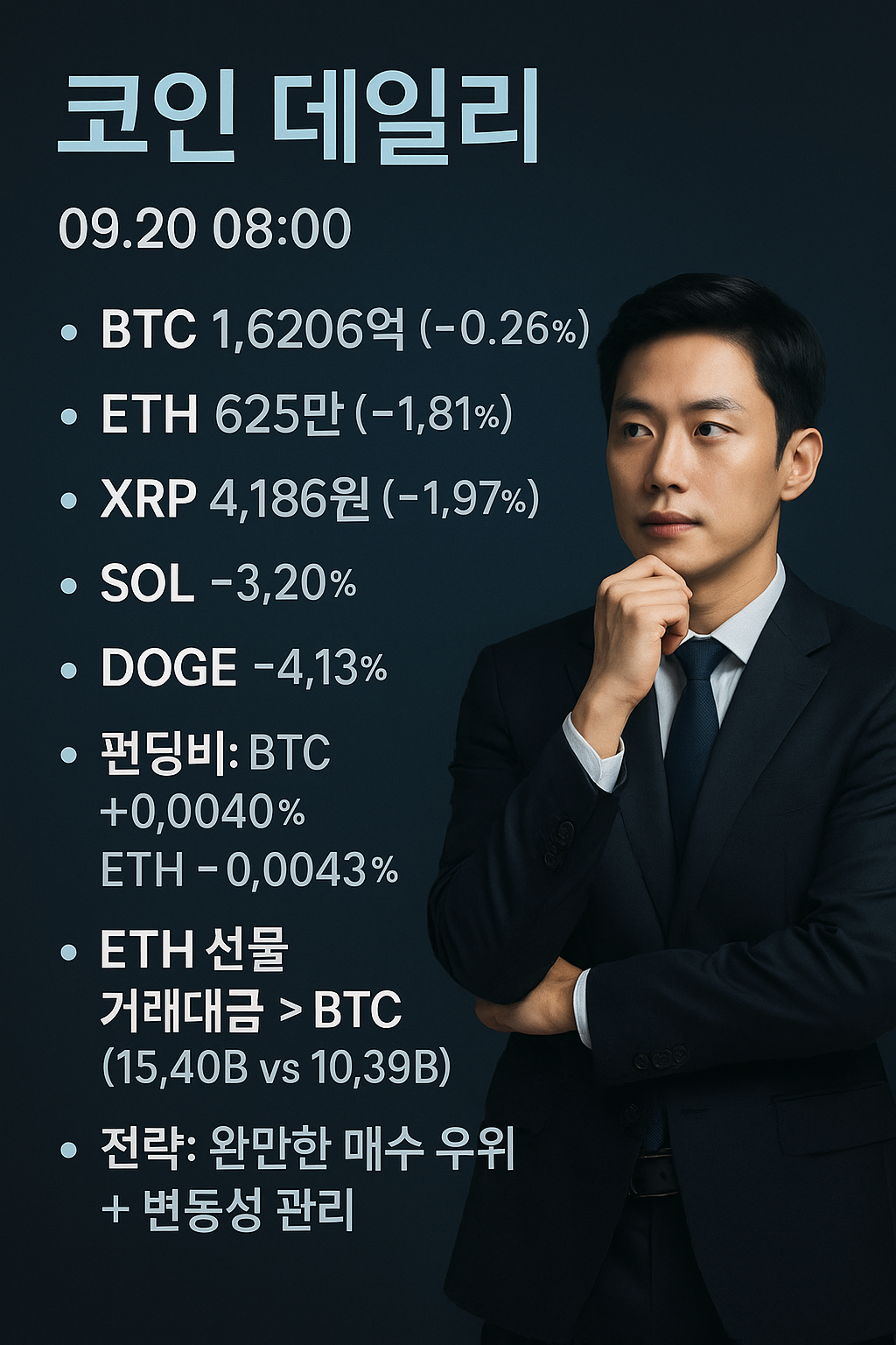 오늘 새벽 비트코인은 1,620만 원대(업비트, -0.26%)에서 숨 고르기, 이더리움은 625만 원(-1.81%)으로 조정폭이 더 컸습니다. 바이낸스 선물 기준으로는 ETH 거래대금이 BTC를 상회했고(ETH 15.40B vs BTC 10.39B), 펀딩비는 BTC 소폭 +, ETH 소폭 **-**로 방향성이 엇갈립니다. 김치 프리미엄은 **거의 중립(±0.1%)**이며, 뉴스·온체인 모멘텀은 “완만한 매수 우위지만 변동성 경계”가 핵심 메시지입니다.