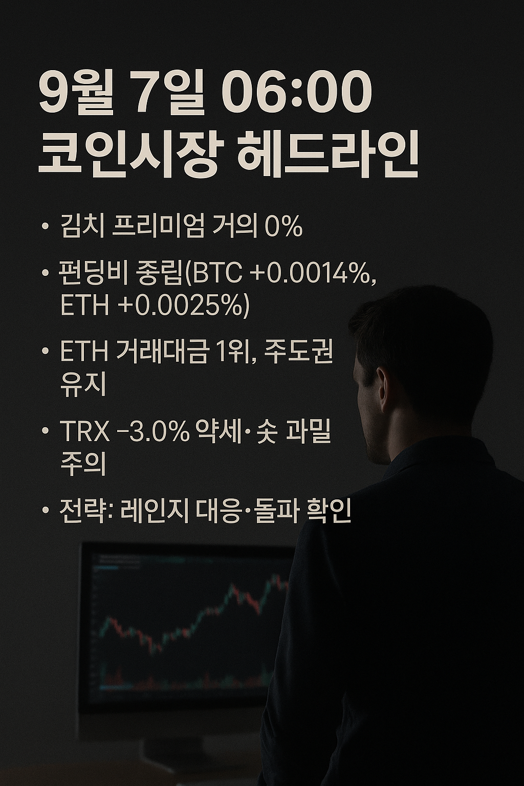 2025년 9월 7일 06:00 코인시장 데일리: 김치 프리미엄 ‘제로’, 펀딩비 중립…뉴스 모멘텀 둔화 속 ‘보수적 낙관’