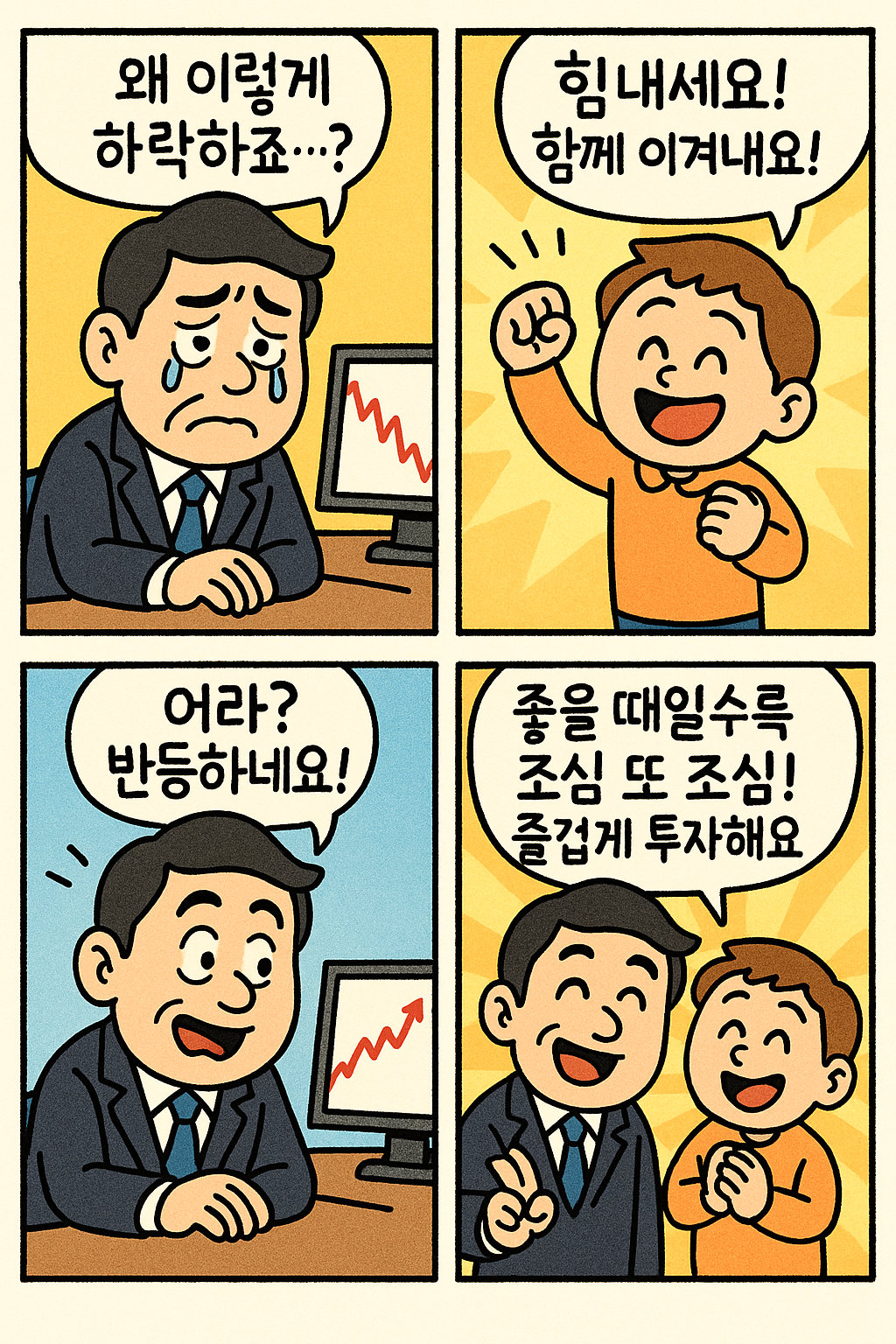 증시의 오르내림에 마음 졸이는 투자자들을 위해 준비한 희화 4컷 만화입니다. 가끔은 복잡한 차트보다, 이 한 컷이 더 큰 위로와 깨달음을 주기도 하죠.