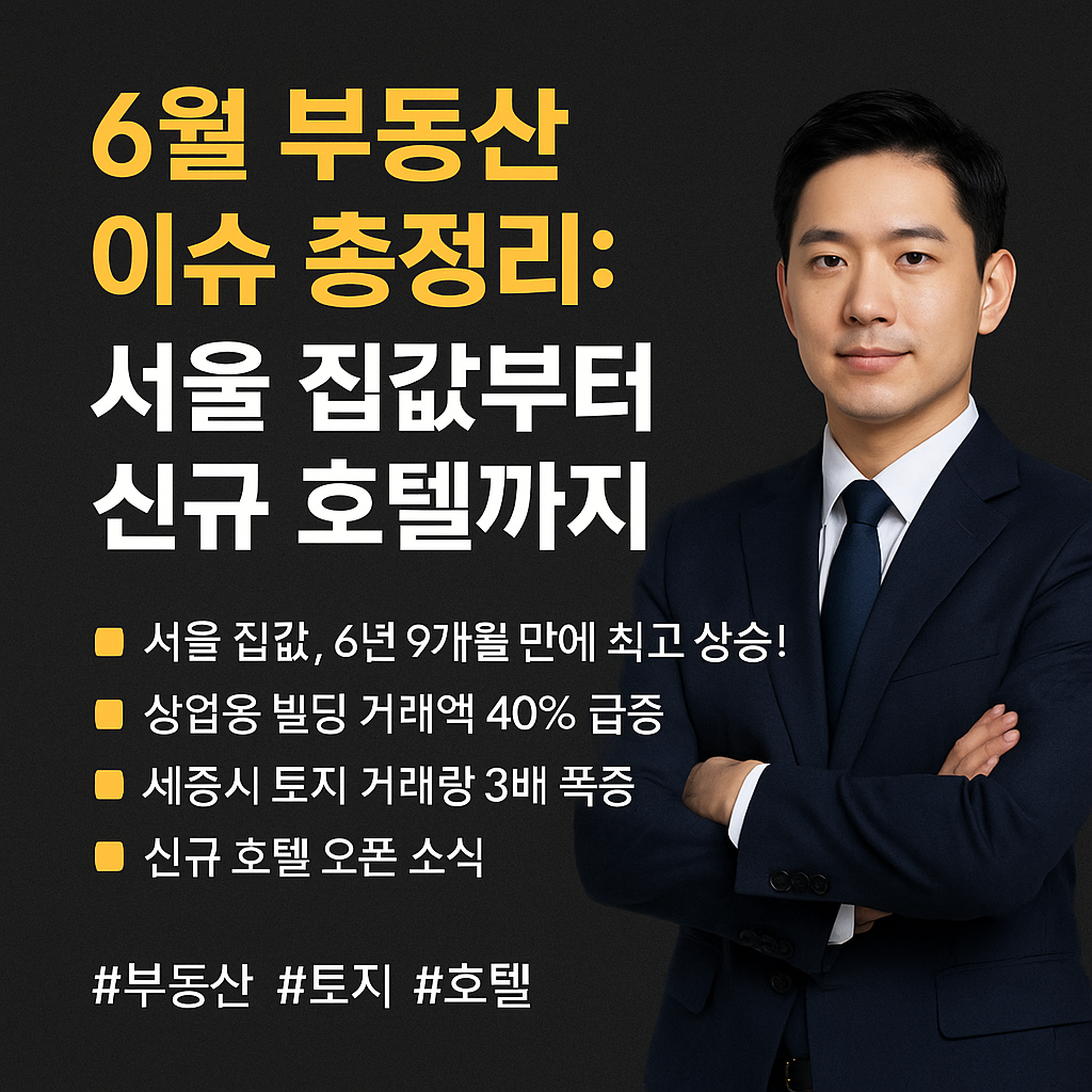 6월 부동산 시장은 서울 집값 급등, 상업용 빌딩 거래 증가, 세종시 토지 활기 등 변화의 물결이 거셉니다. 주요 이슈를 한눈에 확인하세요.